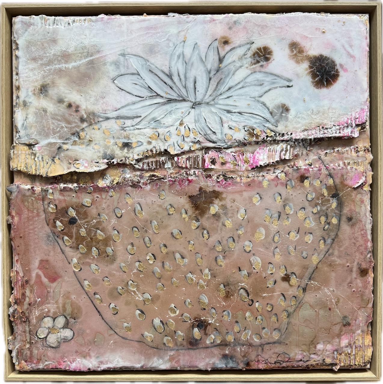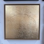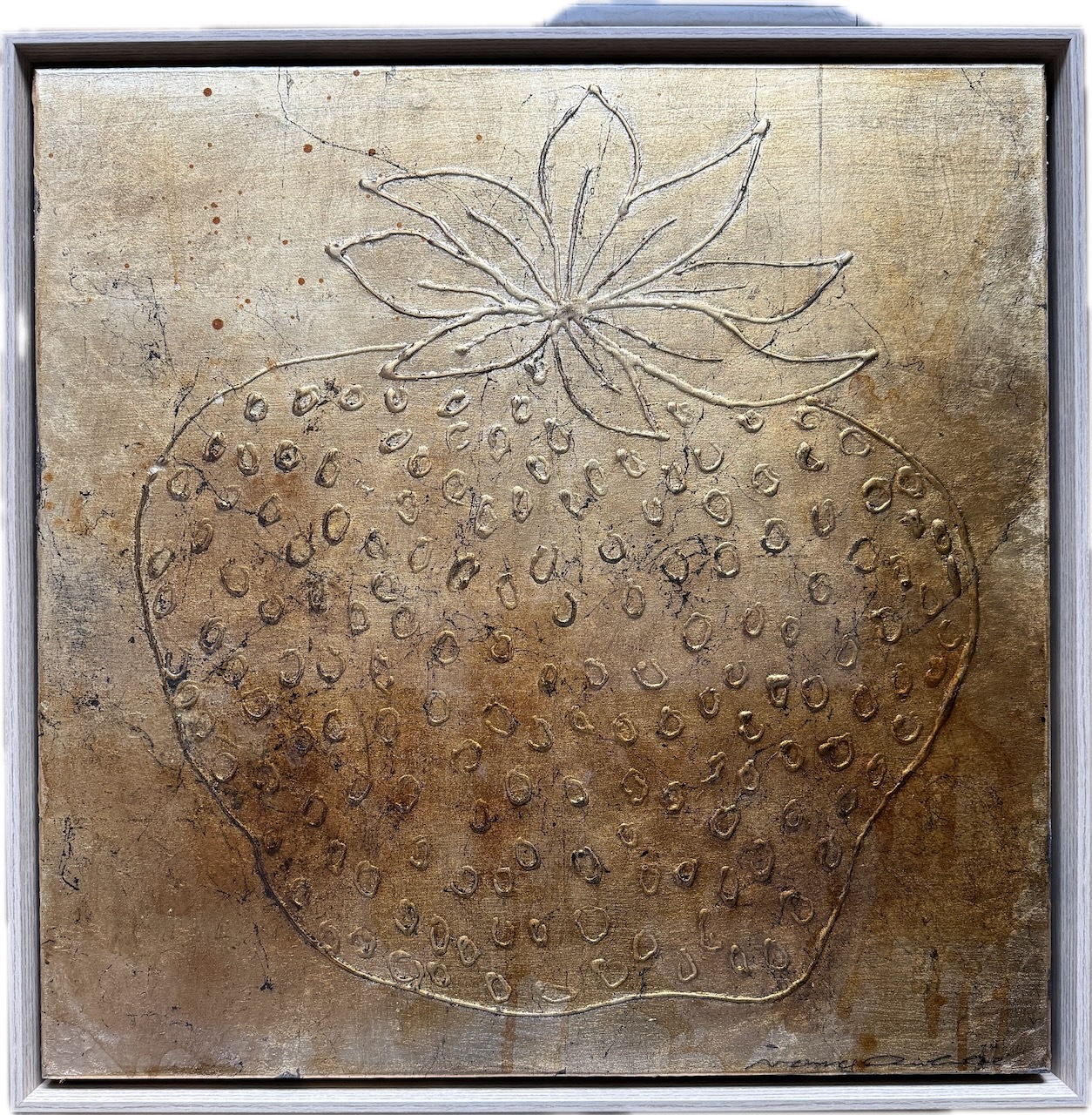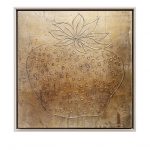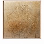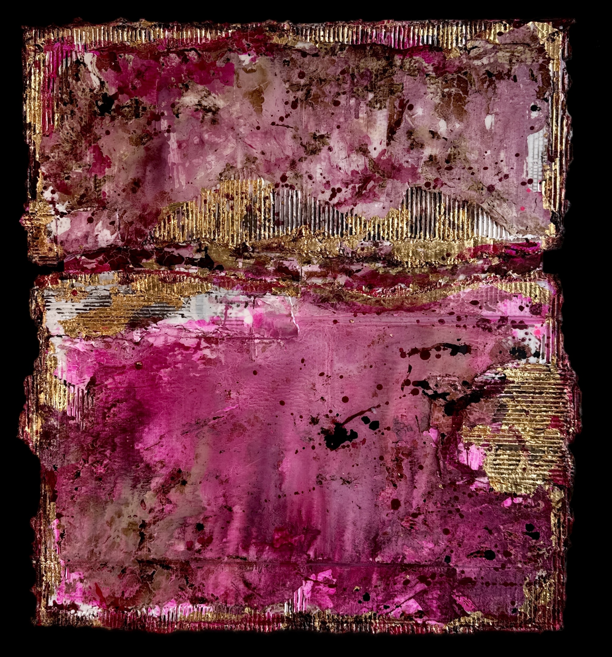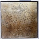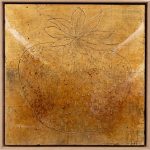 mixed media with pigment, bitumen and gold leaves on canvas in steel frame
